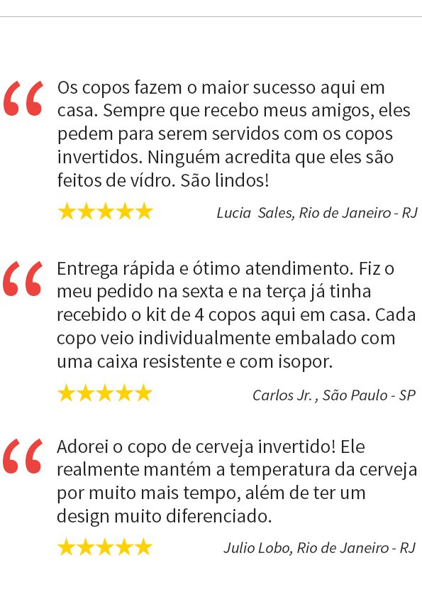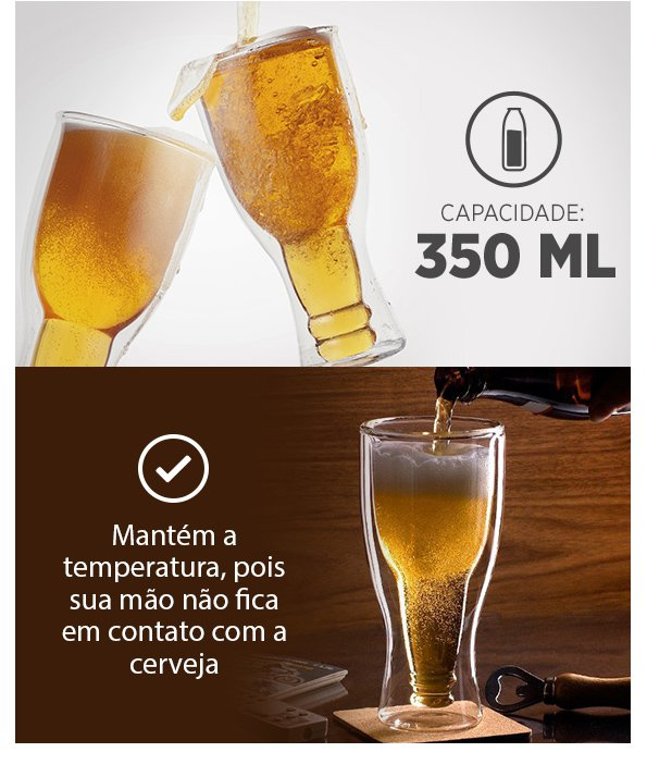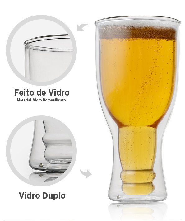 O Copo Invertido é feito de vidro, magistralmente moldado para parecer uma garrafa de cerveja invertida. Os copos são embalados individualmente, envoltos em isopor e dentro de uma caixa de papelão. Todo esse cuidado com a embalagem evita qualquer tipo de dano durante o transporte. Produto importado.Ótima dica de presente para quem adora cervejas artesanais.